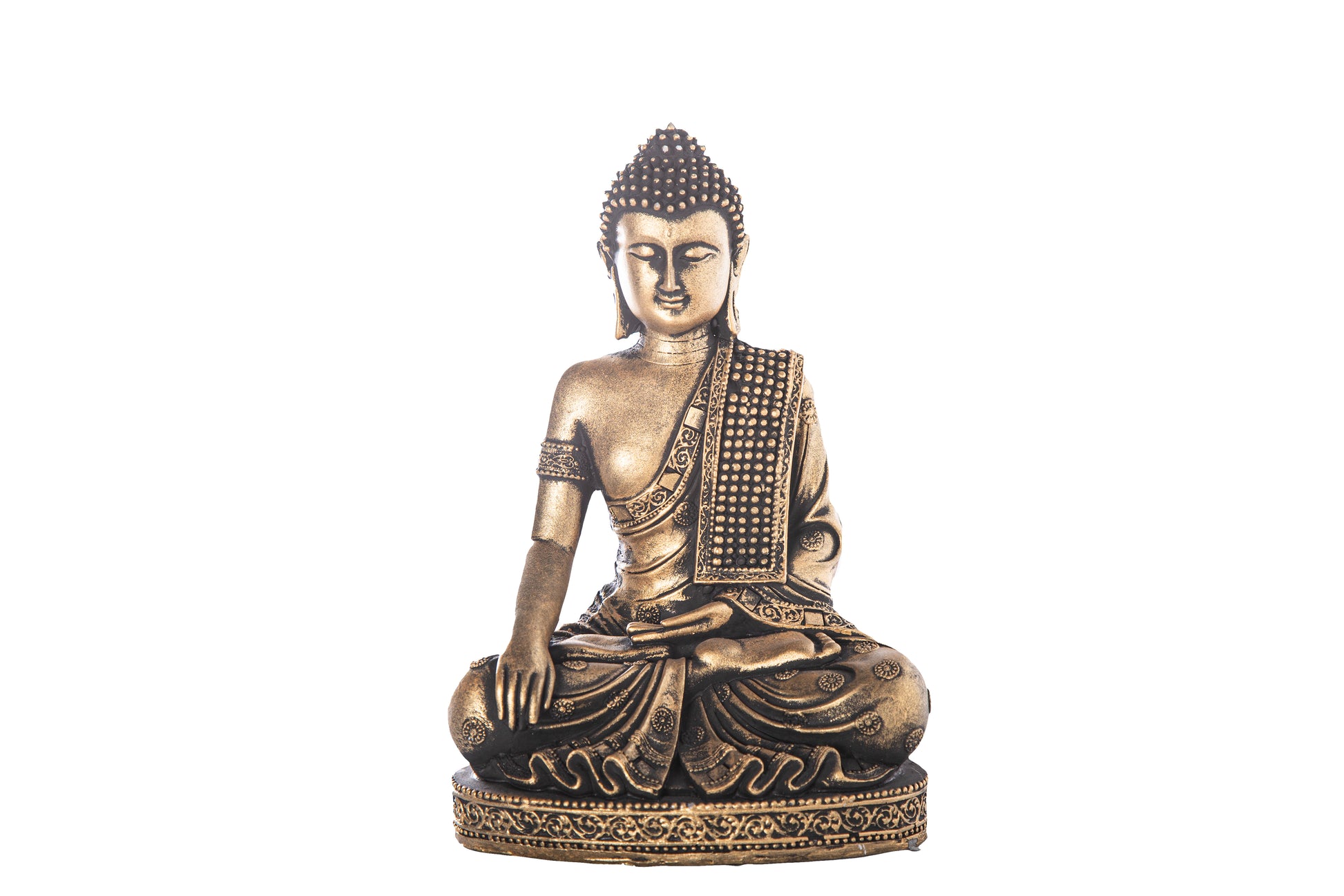 Cement Meditating Buddha Figurine in Bhumisparsha Mudra Posiiton Wearing Shoulder Sash on Base Washed Concrete Finish Gold/Gray