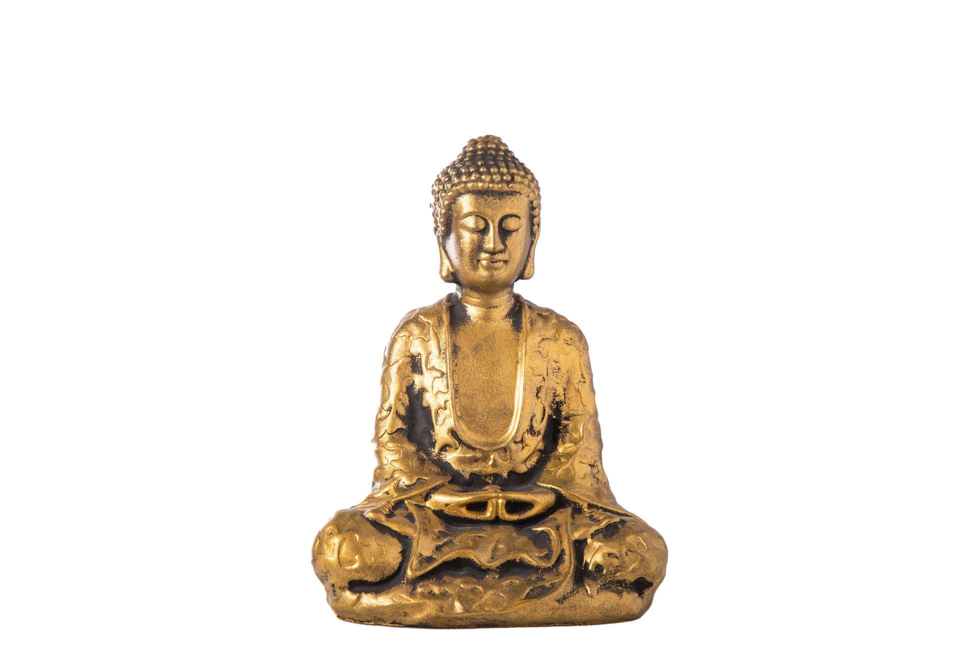 Cement Meditating Curled Head Buddha Figurine in Dhyana Mudra Position Wearing Prime Kasaya Distressed Finish Gold