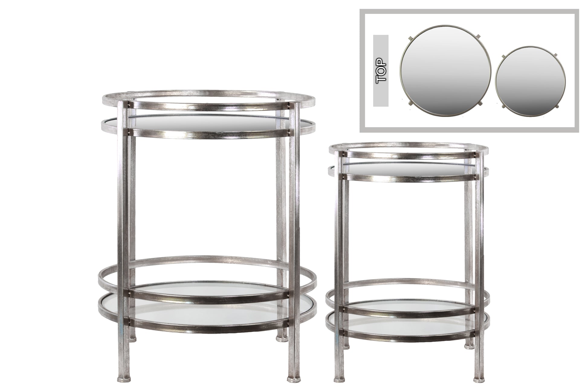 Metal Round Table with Beveled Mirror Base and Clear Glass Top Set of Two Distressed Metallic Finish Gold