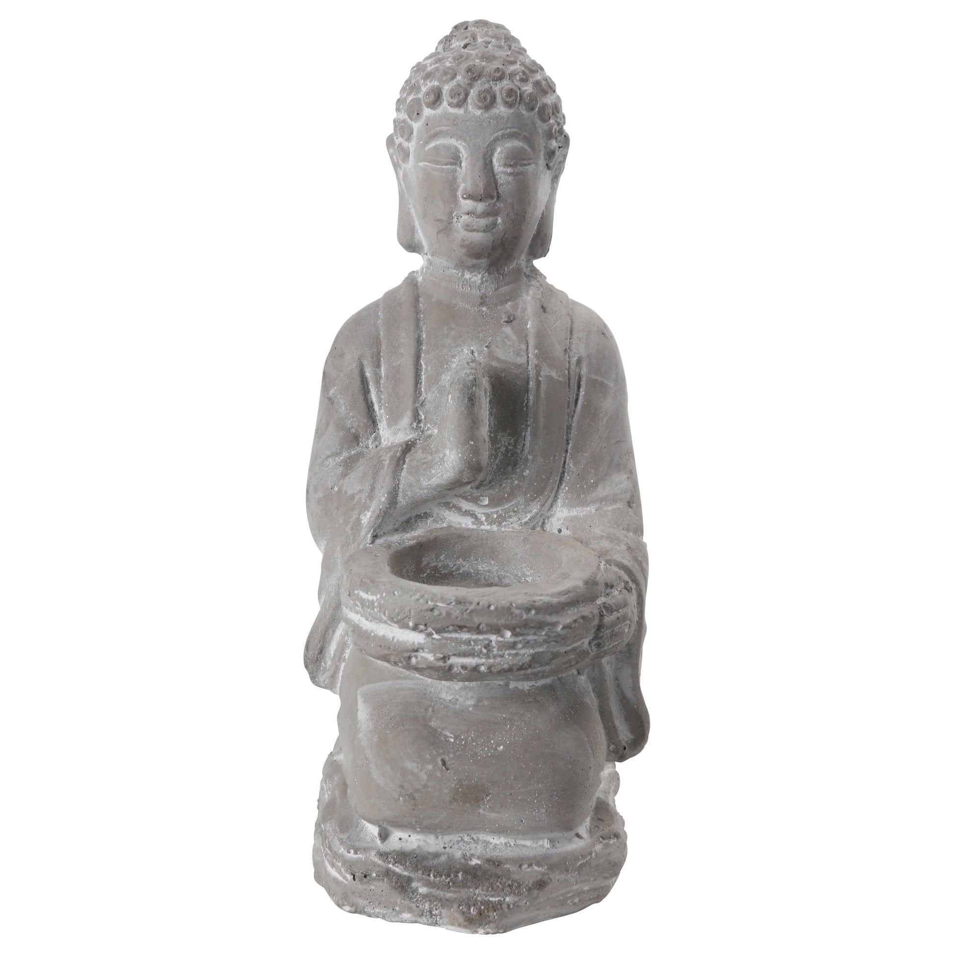 Bring serenity to your space with our Cement Kneeling Buddha Figurine, a perfect blend of spirituality and modern elegance. Featuring the Karana Mudra and Anjali Mudra hand positions, this beautifully detailed piece symbolizes the dispelling of negativity and invites peace into your surroundings. The washed gray finish and flat base with a front candle holder make it a versatile centerpiece for your home, garden, or meditation space.