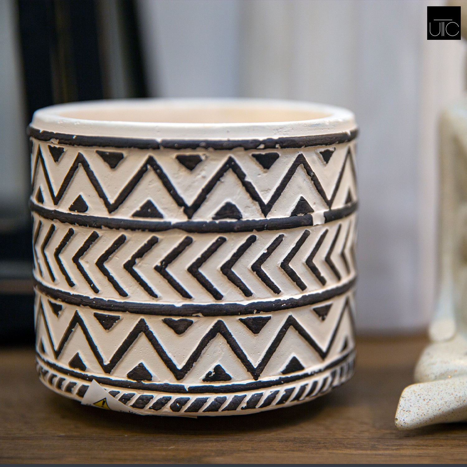 Ceramic Cylindrical Pot with Painted Black Embossed Lattice Chevron Design Body and Tapered Bottom SM Washed Finish White