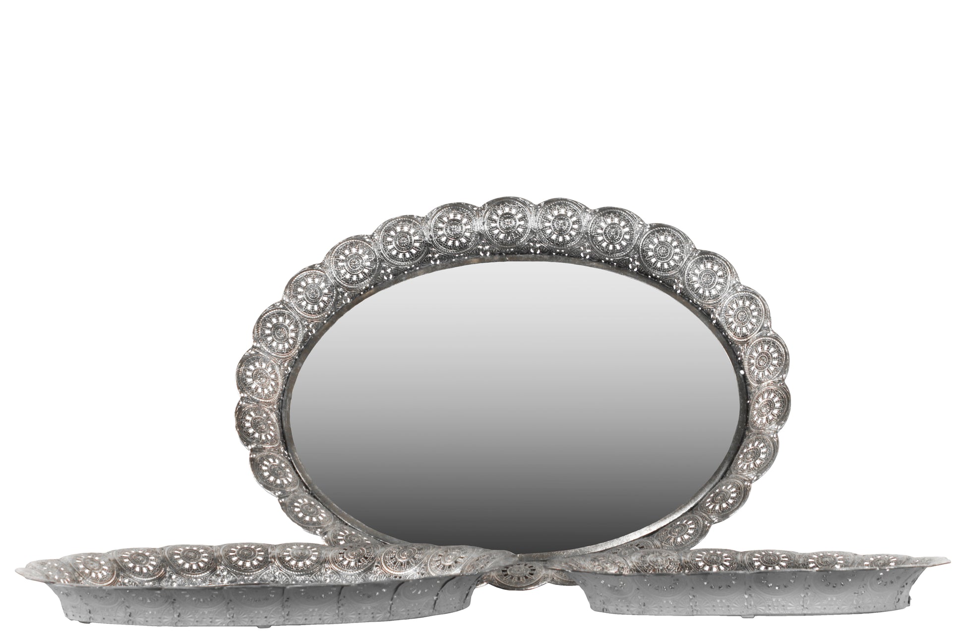 Metal Oval Tray with Mirror Surface and Pierced Metal Frame Set of Three Electroplated Finish Silver