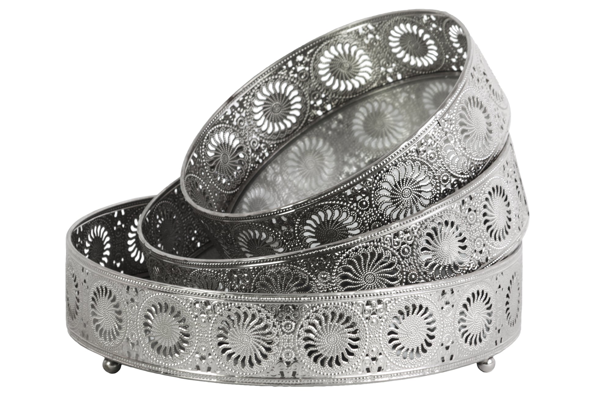 Metal Round Tray with Mirror Surface and Sunburst Design Pierced Metal Sides Set of Three Polished Chrome Finish Silver